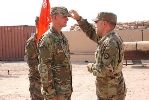 U.S. Army National Guard Capt. Joshua Wiltfong, right, C. Company commander, promotes 2nd Lt. Casey Witkowski, left, also a member of C. Company, to the rank of first lieutenant during a morning formation at Camp Buehring, Kuwait, Oct. 10, 2018. C. Company deployed with the 935th Aviation Support Battalion in support of Operations Inherent Resolve and Spartan Shield. (U.S. Army National Guard photo by Sgt. Billie Thompson)