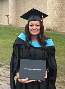 “That was the thing that drew me to Arkansas State — it was completely online, which really helped me out,” she said. “I have three kids, my husband’s a football coach, and I’m working full time. There’s just no time for me to go to school physically.”